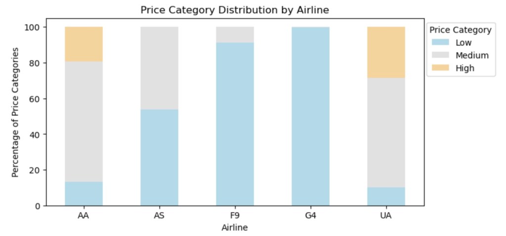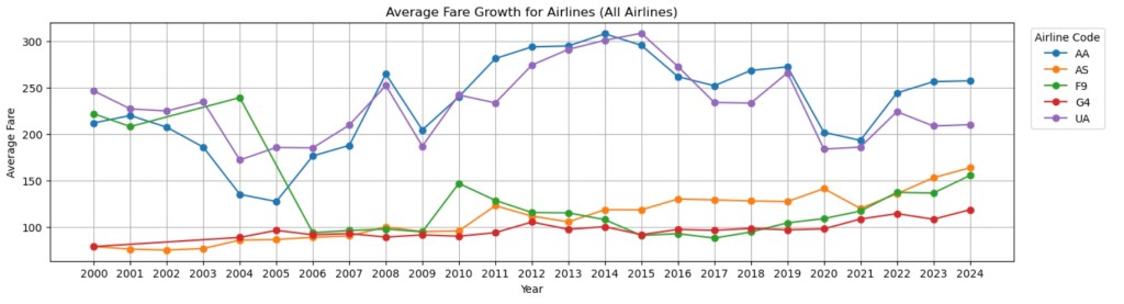- Airline Fare Adjustments: Examining how airlines like UA and AA (high-priced) and G4, F9 (low-priced) adjust fares based on demand and the pandemic.